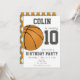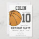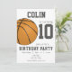 Convite para Design de basquete. Uma basquete ultra legal estilizada com linhas pretas metálicas e aparência texturizada de couro laranja e um fundo de laranja e cinza elegante no verso. Personalize este convite para qualquer criança atlética em letras de estilo varsity. O convite perfeito para uma festa temática de basquete. Simples o suficiente para crianças mais velhas, esportista o suficiente para qualquer criança, e diversão o suficiente para qualquer festa.