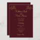 Este é um convite de casamento ao estilo minimalista simples em burgandy escura e com um texto em cor bege suave e um simples buquê de folhas.