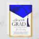Convide seus entes queridos para comemorar sua festa de formatura com este convite minimalista limpo para homens com tipografia "Chapéu ao Formando" e "Formando", chapéu de graduação azul, quadro de borda dourada e foto personalizável. Personalize o convite ao seu gosto.