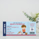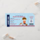 Convite de tíquete desportivo em vermelho e azul marinho com fundo azul. Perfeito para festa de aniversário/chá de fraldas.