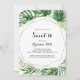 Este convite de aniversário de destino geométrico doce 16 é perfeito para um aniversário tropical. O design apresenta palma verde-aquarela pintada à mão e folhas de bananeira bem organizadas em belos buquês, enfeitando um quadro geométrico dourado.