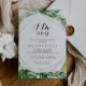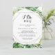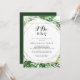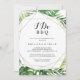 Este convite de festa de noivado de destino geométrico "Eu faço" é perfeito para uma festa de noivado tropical, janto de ensaio, chá de casais, após festa ou qualquer evento de casamento. O design apresenta palma verde-aquarela pintada à mão e folhas de bananeira bem organizadas em belos buquês, enfeitando um quadro geométrico dourado.