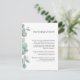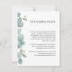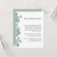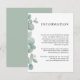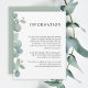Uma bela moldura de eucalipto em aquarela destaca este cartão de informações de casamento moderno usado para fornecer aos seus convidados detalhes, acomodações de hotel, seu site de casamento ou outras informações úteis relacionadas ao seu casamento. Personalize o texto de exemplo mostrado no modelo de texto com os detalhes desejados. Esses cartões podem ser enviados como um anexo com os convites de casamento. Uma suíte de produtos de papelaria combinantes está disponível neste design para coordenar seu casamento ou evento com um estilo lindo.