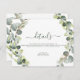Cartão de detalhes do casamento de primavera com aquarela botânica de eucalipto suculenta em fundo branco - inclui tipografia de script bonita e elegante com folhas botânicas modernas e folhagem para a celebração especial do dia do casamento.