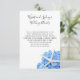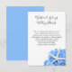 Cartões de cerimônias de detalhes do casamento azul do Jardim do Mar. Tamanho 4x5 mostrado ou escolha um tamanho menor para ajustado dentro envelope de convite. Personalize o texto em dois locais com o script no topo e o texto impresso no formulário de parágrafo. Esta elegante design de praia tem uma grande estrela do mar branca (estrela do mar) e uma bela flor azul de hydrangea no fundo. As placas são brancas com texto preto. Incluir informações que os convidados precisarão para um evento de destino (viagem, hotéis) ou instruções para a cerimônia e/ou recepção. O reverso é azul sólido.