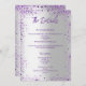 Um moderno e elegante programa/programa/cronograma de casamento. Um fundo com aspecto fino prateado, decorado com brilho violeta e lavanda. Personalize e adicione seus nomes e detalhes do casamento. Letras coloridas violetas. Texto de ambos os lados.