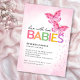 Este adorável convite para chás de fraldas de temas para borboletas apresenta duas borboletas cor-de-rosa para um convite temático para meninas gêmeas. O design é acentuado com o texto lúdico "devido a dois BEBÊS", que combina a letra da moda com letras de blocos multicoloridas para um convite alegre.