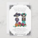 Este convite personalizado da festa do Dia dos Mortos ou do Dia de Los Muertos. Uma ilustração colorida dos esqueletos é colocada no centro, com uma moldura de estilo vintage destacando os cantos. Um esqueleto macho e fêmea é fotografado no centro, em um estilo de arte do crânio de açúcar, acentuado com flores. É perfeito para uma festa de Halloween ou Dia dos Mortos.
