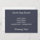 Isso pode ser usado para convidar a participação em um projeto de limpeza de bairros, um comício pela legislação ambiental ou outro evento relacionado ao Dia da Terra. Uma representação alegórica dos perigos das alterações climáticas. Apresenta uma linha de pegadas, "pegadas de carbono", que derreteram através do conjunto de gelo polar. "Dia da Terra" é representado como gelo separador; "Pegadas de Carbono" como cinza ou fuligem; talvez quedas de petróleo. Por favor, caminhe levemente sobre a Terra.
