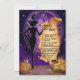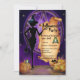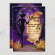 Uma bruxa preta trincada em frente a um pentagrama roxo com abóboras no primeiro plano, seu gato preto familiar e um casal de sapos, está convidando você para a festa de Halloween. Se se atreve a recusar, esteja preparado para ser transformado num sapo! (E como bônus adicional você pode verificar suas regras no verso do convite).
