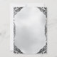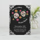 Este convite de festas colorido apresenta um Dia de los Muertos ou Day ou o tema do Morto sobre um fundo preto. Dois crânios de açúcar são acentuados com flores cor-de-rosa e laranja, e verde floral. Um quadro de estilo de folha prateada ornamentado borda o convite.