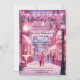 Um doce convite de festas romântico de Dias de os namorados com um casal apaixonado andando por uma rua de fantasia rosa com luzes festivas.