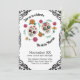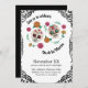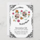 Este convite de festas colorido apresenta um Dia de los Muertos ou o Dia ou o tema do Morto. Dois crânios de açúcar são acentuados com flores cor-de-rosa e laranja, e verde floral. Um quadro preto ornamentado borda o convite.