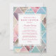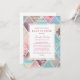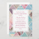 Convite para chás de fraldas em tons suaves de rosa e azul com um padrão de diamante repleto de fotos de flores, praias e céus.