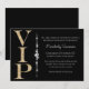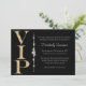 Este convite de festa personalizado apresenta um tema glamoroso e elegante em um fundo preto. O título VIP é impresso em um design de brilho dourado à esquerda. Uma faixa de diamantes separa a área de texto. É perfeito para uma festa de aniversário, chá de noiva ou outra celebração fabulosa.