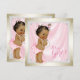Convite de chá de bebê de menina étnica com adorável bebê étnica vestindo calças rosa com babados e uma linda corrente de pérolas em um belo fundo rosa e dourado com diamantes e pérolas. Este adorável convite de chá de bebê de menina étnica é facilmente personalizado para o seu evento adicionando detalhes do evento, estilo de fonte, tamanho e cor da fonte e texto. Este é um design impresso sem diamantes, pérolas, laços reais, etc.