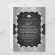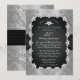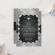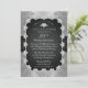 Convite de aniversário de casamento de 25 anos brilhantemente sofisticado e elegante com fundo sobreposto com aspecto de renda preta e prateada e fita de cetim preta impressa com diamantes em forma de coração, lágrima e redondos dispostos em uma moldura retangular arredondada. A fita de cetim preta e o fundo de renda preto e prateado continuam no verso para um visual sofisticado e elegante. Design original de Holiday Hearts Designs (todos os direitos reservados). Por favor, note que todos os enfeites são impressos.