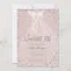 Um modelo doce 16, simples, moderno, elegante e chic, com fundo cor-de-rosa, cordas de pérolas em uma princesa vestida de pincel e com rufas nos corpúsculos, borrifadas de diamantes (simulados, não verdadeiros diamantes) e tipografia moderna em branco. Um design de "ouros e pérolas".