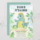 Um convite para chá de fraldas de menino bonito com o título "Rawr It's a Boy" junto com um dinossauro pintado com aquarela e verde.
