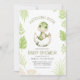 Bem-vindos a sua pequena chocada com este adorável convite para chás de fraldas de dinossauro de aquarela! Apresentando um doce dino bebê espreitando de um ovo salgado, cercado por sotaques verdes macios, esta design caprichosa é perfeita para um tema "Chapeuzinho". A paleta de cores neutra em termos de gênero faz dela uma escolha excelente para celebrar qualquer chá de fraldas. Personalize com os detalhes do seu partido para criar uma lembrança memorável para a família e os amigos.