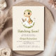 Este chá de fraldas bonitinho apresenta um beige doce e um dinossauro verde-aquarela emergindo de seu ovo acima das palavras "Hatching Soon!" na fonte de impressão verde-oliva. Personalize o texto com o nome da futura mãe em verde e os detalhes em cinzas de carvão serif em um fundo bege neutro.