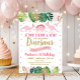 Este adorável convite de aniversário apresenta folhas de aquarela tropicais com embelezamentos de folhas com brilho dourado e dinossauros cor-de-rosa.
