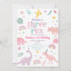 Este adorável convite de aniversário apresenta dinossauros desenhados à mão, arco-íris e folhas em cores pastéis.