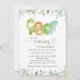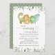 Convide amigos e família de estilo e dê o tom para seu dia especial com este charmoso convite para chás de fraldas. A design apresenta dinossauros (brontosauros, triceratops, tiranossauro rex) e verde sobre fundo branco.
