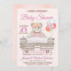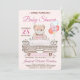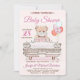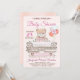 Dirigir através de chá de fraldas para uma menina com ursinho de pelúcia e carro vintage, balões e fundo de aquarela. Esta unidade através do convite do chá de fraldas pode ser facilmente personalizada para criar o convite perfeito para o seu evento. Design por Amelia Carrie