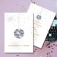 Marque a cena de uma comemoração temática do Disco. Branco é a cor de fundo para este design de Janto de ensaio de casamento elegante e personalizado da bola Disco. As manchas de prata também estão no design. Altere facilmente as informações para o seu próprio convite personalizado. Elegante design de casamento formal.