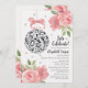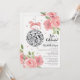 Um belo e glamouroso chá de panela temático discográfico com uma bola de disco prateada pendurada por uma fita rosa pálida com sotaques de pote prateado e pequenos corações cor-de-rosa num papel branco ondulado que parece fundo. O bonito rosa floral rosa e as bordas das pedônias completam este convite de festas femininas e femininas de dança feminina. Perfeito para um casamento temático da discoteca ou chá de casais ou festa de noivado de dança. Projetado por Chrissy H. Studios, LLC. Todos os direitos reservados.