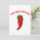 Um personagem de desenho animado de pimenta vermelho e quente. Design original com impressão de efeito de brilho inverso. Cartões personalizados para convites e anúncios. Ideia de decoração para amantes de comidas picantes.
