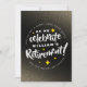 Apresentando cartas manuscritas divertidas com estrelas estilizadas e brilho dourado desaparecendo em um fundo negro empoeirado, este convite para aposentadoria festiva pode ajudá-lo a montar a festa perfeita para aposentadoria. Adicione o nome da honra, data do evento, detalhes do local, nome(s) da(s) parte(s) de hospedagem e mensagens personalizadas, conforme desejado. Design © W.H. Sim. Mais informações em zazzle.com/expressionsoccasions