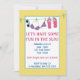 Este convite de festa de aniversário na piscina apresenta um par de óculos de sol, um maiô e chinelos pendurados em uma corda e campos de texto personalizáveis.