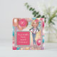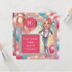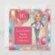 Caractere de caricatura. Celebre um marco com esta divertida e personalizada design do Sweet 16! Apresentando uma caricatura personalizada, roupa de denim e balões coloridos em um quadro brilhante de rosa-ouro, é perfeito para uma cesta de aniversário moderna. Funciona melhor se o cabelo estiver preso na sua foto.