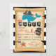 Pirateie a baleia e a estrela do mar com o rolo velho do mapa e design de cartão preto e branco do convite do aniversário do fundo da listra.