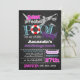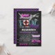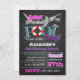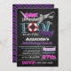 Convites do aniversário da festa na piscina do tubarão do quadro - caracterize um fundo do quadro na parte dianteira em um tema náutico com elementos do conservante e da bandeira de vida. Cores das características de design do rosa quente, do aqua, do roxo, das cinzas, do branco e do preto. O tema principal é uma grande silhueta de um grande tubarão branco na parte superior. A parte traseira caracteriza um fundo de harmonização do quadro com impressão da viga sobre a parte superior nas máscaras de roxo e de branco.