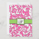 Convites do casamento tema damasco do rosa quente & do verde limão---combine os cartões de RSVP e mais encontraram abaixo nesta página. Cada convite caracteriza um impressão do damasco da folha floral no branco sobre um fundo do rosa quente. A parte dianteira e a parte traseira igualmente caracterizam uma banda do verde limão com um monograma quadrado que você possa personalizar à inicial do sobrenome do noivo.