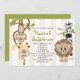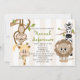 Convites bonitos do chá de fraldas do safari com um leão doce do bebê que veste um par de fraldas com os pinos verdes da fralda nele com seus amigos da zebra, do macaco e do girafa que cercam o em um fundo listrado. Isto convida é perfeito para um chá de fraldas temático da selva para que as mamães esperem um rapaz pequeno. © Chrissy H. Estúdio dos trabalhos de arte, LLC. Todos os direitos reservados.