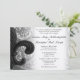 Este convite inteiramente customizável do casamento está pronto para seus informação pessoal e nomes. Caracteriza uma flor de lis clássica proeminente do ferro contra um fundo desvanecido da tapeçaria. Mostrou no papel metálico de prata.