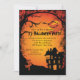 Comece a festa de Halloween com o convite da festa de Halloween. O nosso convite à casa assombrado apresenta uma casa assombrada sobre um fundo negro e laranja com uma árvore assustadora e uma lua com morcegos. Visite nosso compro em www.celebrateitholidays.com para uma grande seleção de itens de férias. Personalize com suas informações pessoais e você está pronto para ir.