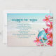 Envie convites com um tema de praia tropical para uma festa de férias. Flores de plumeria cor-de-rosa, um amistoso e um ornamento de bola azul-lacrimogêneo decoram a borda sobre um fundo de areia de praia. "Celebrar a estação" é o texto ao longo do topo, que pode ser alterado. Adicionar informações de convite de festas no formulário de parágrafo. O reverso também é decorado com o padrão das flores havaianas sobre o azul escuro.