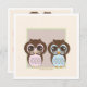 Informe aos seus convidados as notícias do excelente com este design com uma doce ilustração de dois adoráveis bebês de coruja - um menino e uma menina. Personaliza-se facilmente com as suas informações e com todo o conjunto! Os itens correspondentes incluem postagens, cartões de agradecimento e adesivos para selar seus convites ou anúncios para o chá de bebê.