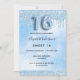Um convite moderno, na moda e glamouroso para uma festa de aniversário Doce 16, 16. Um céu branco e azul claro como fundo com brilho azul claro, pingado de tinta pingando. O nome é escrito com um moderno script de estilo escrito à mão preto. Personalize e adicione os detalhes da sua festa. O número 16 é escrito com uma fonte de estilo de balão, script.