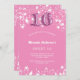 Um fundo rosa. Decorado com estrelas brancas. Texto branco. Personalize e adicione um nome e detalhes da parte.