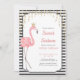 Um único e moderno convite de aniversário de 16 anos apresenta um flamingo cor-de-água rosa vestindo uma coroa de ouro, com uma garland de folhagem dourada pendurada sobre um fundo de listras preto e branco com texto rosa. A parte traseira da placa apresenta listras brancas e pretas com um confete dourado. Personalize com os detalhes do seu partido em letras clássicas em preto e rosa. Copyright Elegant Invites, todos os direitos reservados.