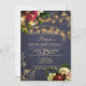 Um belo e rústico convite tradicional de inverno, doce 16, com flores buquês de rosas escuras de burgundy escura, vermelho e creme de pêssego, e peônias, cordas de luzes cintilantes e um roteiro de caligrafia em ouro falso, sobre um fundo escuro de marinho azul-escuro. +++++++++++ O convite também é adequado para qualquer outra noite de verão ou outono no país rústico / quintal exterior / festas de aniversário de marco agrícola, comemorações ou aniversários.