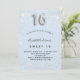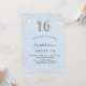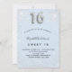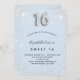 Um convite moderno, na moda e glamouroso para uma festa de aniversário Doce 16, 16. Um fundo azul bebê, decorado com falso brilho prateado, brilhos. Personalize e adicione o seu nome e detalhes da festa. O número 16 é escrito com uma fonte de estilo de balão, script.