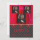 A placa frontal tem uma seda vermelha vívida caindo como uma cortina e um véu rosa sobre ela. A segunda metade é um simples padrão tecido preto. Na seda vermelha, há 3 fotografias. Entre os padrões preto e vermelho, há uma linha de pérolas brancas creme decoradas com três brochuras de arco de fita de cetim vermelho. Cada broche tem pérolas brancas creme e diamantes amarelos. A parte de trás do cartão tem duas cordas de pérolas, que é uma moldura para um fundo avermelhado onde o texto é escrito a preto. Por trás da armação de pérolas, há o mesmo padrão tecido preto.