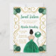 Este doce 16 convite apresenta uma elegante estrutura de ouro, uma bela princesa de cabelo castanho e um vestido verde, flores e um balão. Isto é perfeito para uma doce festa de aniversário de dezesseis.